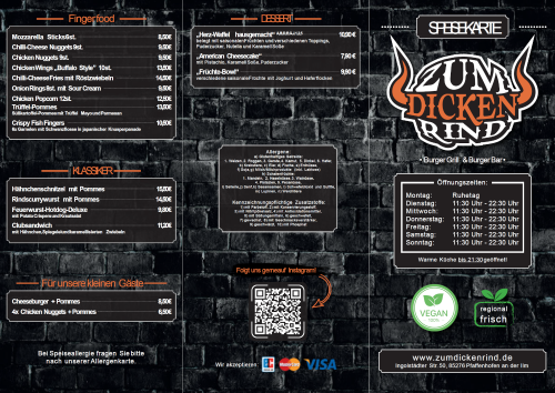 Egal, ob Sie ein eingefleischter Burgerfan sind oder lieber zu vegetarischen und veganen Optionen greifen – im Zum dicken Rind kommt jeder auf seine Kosten. Kommen Sie vorbei und lassen Sie sich von unseren innovativen Kreationen verwöhnen. Wir freuen uns darauf, Sie bald bei uns begrüßen zu dürfen!